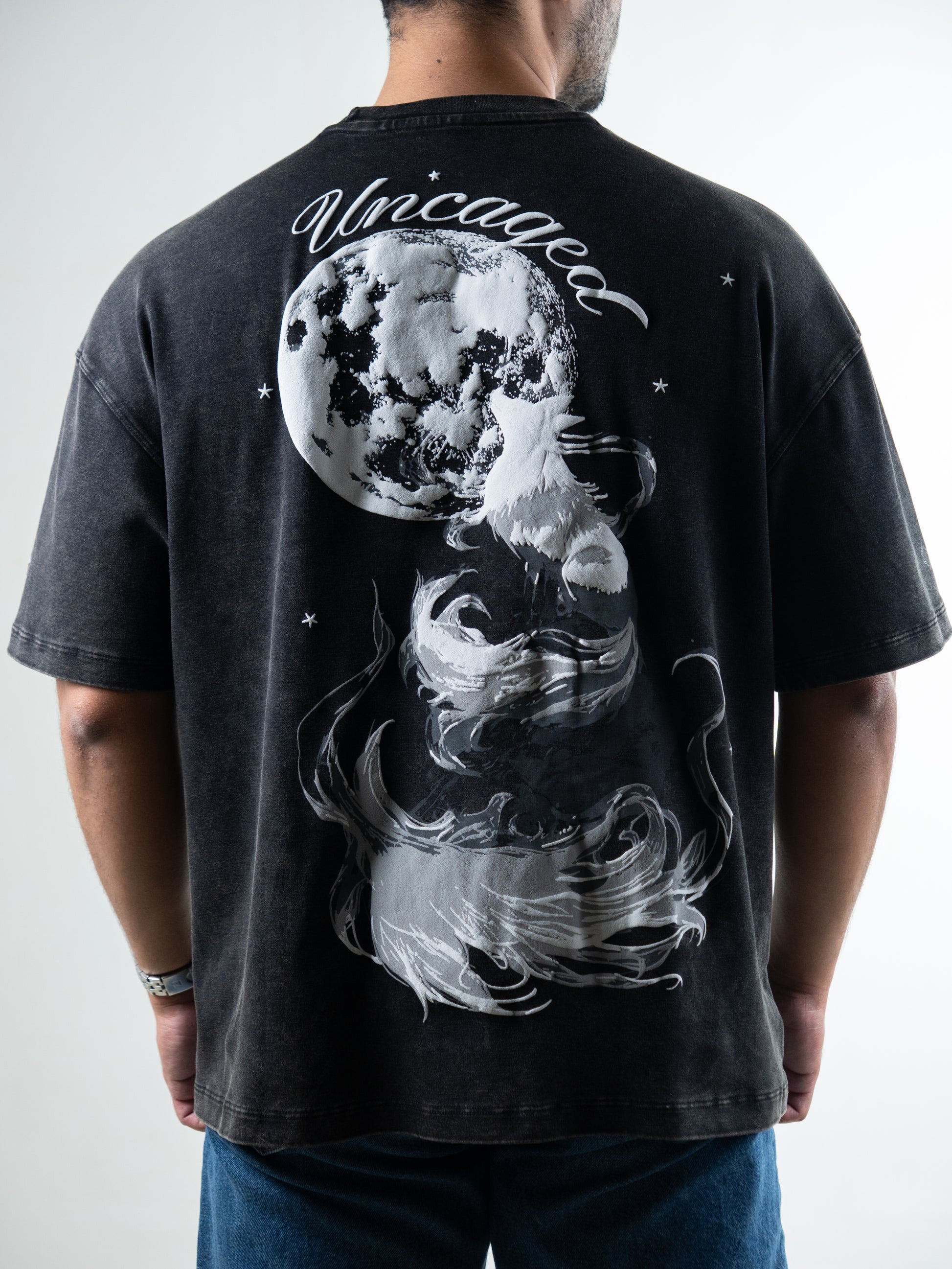 The back features a striking puff print graphic that rises from the fabric, adding a tactile edge that feels as good as it looks. An acid wash treatment gives the shirt its moody, faded texture — each piece unique, with subtle variations in tone that make it truly one of a kind.